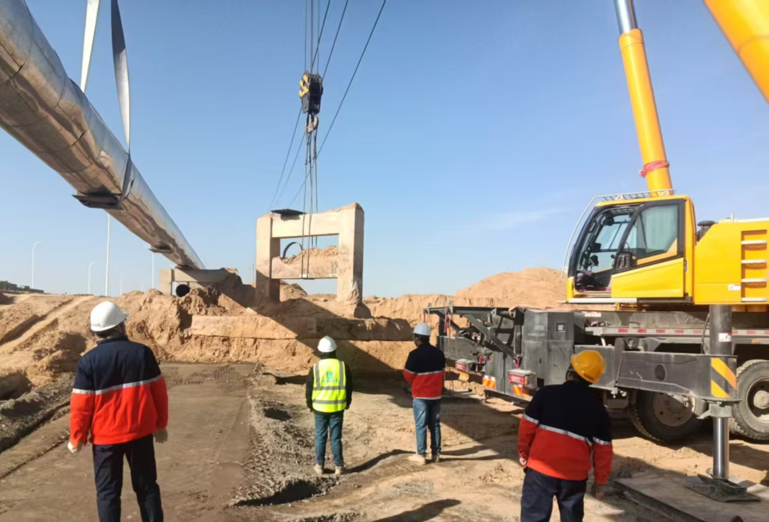與此同時,化工熱電公司迅速聯(lián)動久安檢修公司開展支援協(xié)作,第一時間調(diào)配25噸吊機(jī)及專業(yè)施工團(tuán)隊抵達(dá)現(xiàn)場,對沉降嚴(yán)重的管道段實施調(diào)運卸壓,并為兩側(cè)沉降較輕區(qū)域加裝墊鐵進(jìn)行臨時固定。然而,傍晚時分現(xiàn)場突發(fā)緊急情況,墊鐵基礎(chǔ)沉降加劇,25噸吊機(jī)負(fù)荷即將觸及安全閾值。面對險情,搶修小組連夜協(xié)調(diào)70噸重型吊機(jī)進(jìn)場替換,科學(xué)加固管道,成功化解突發(fā)風(fēng)險,全程保障園區(qū)供汽平穩(wěn)有序,未出現(xiàn)任何中斷情況。